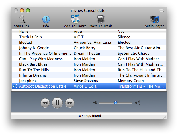 iTunes Consolidator has a built in audio player for listening to the songs found in you music folder. This gives you the chance to decide what you wish to do with the songs.