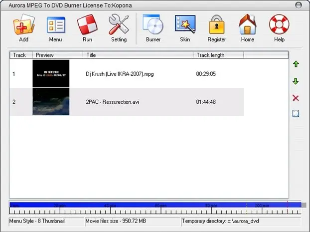 Aurora MPEG To DVD Burner can burn AVI, MPEG files to a DVD-R, DVD+R, DVD+RW, DVD-RW disc, so that you can play your movies on DVD player. It is a revolutionary and versatile DVD creator. With this software, you can create a real DVD, not only a MPEG file on your hard disk. With the collaboratively use of Aurora Media Workshop you can convert, join, split any format video files to mpeg and burn to Rewritable DVD disc.