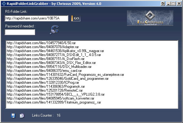 This tiny tool grabs all rapidshare links from any rapidshare folder. It supports password protected folders and subfolders.