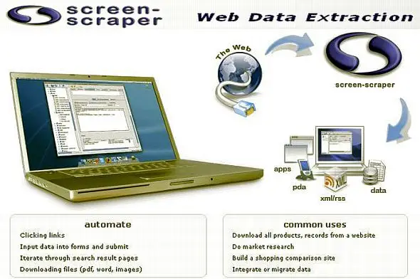 Screen Scraper v5.0 Enterprise Win/Mac/Linux/Solaris | 360 MB Screen-scraper is a cross-platform tool for extracting data from Web sites, which comes in three editions: a free Basic Edition, and two commercial editions: Professional Edition and Enterprise Edition. It consists of a proxy server that allows the contents of HTTP and HTTPS requests to be viewed, and an engine that can be configured to extract information from Web sites using special patterns and regular expressions. It handles authentication, redirects, and cookies, and contains an embedded scripting engine that allows extracted data to be manipulated, written out to a file, or inserted into a database. It can be used with PHP, .NET, ColdFusion, Java, or any COM-friendly language such as Visual Basic or Active Server Pages.