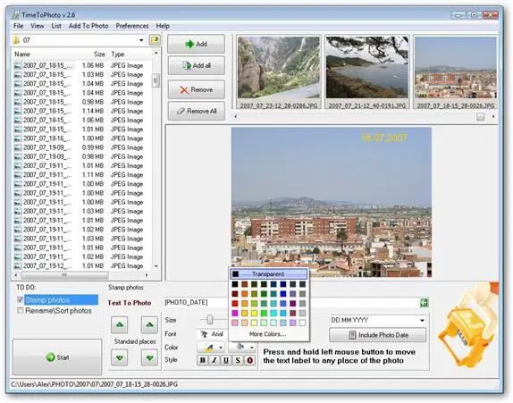 TimeToPhoto 2.6 4591 | 5.6 MB Most of digital cameras don't add datestamps to digital photos. TimeToPhoto helps you if you want see on your photos date and time when you made it. TimeToPhoto allows you to add datestamps or memory labels to selected photos by one mouse click. Just select photos with TimeToPhoto and press RUN to get the date to print on all of your selected photos automatically. TimeToPhoto automatically reads the date of original picture from a file and places a datestamp and/or any text label to photo.