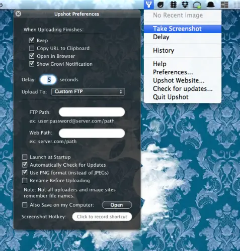 Upshot can take and share screenshots. When you take a screenshot with Upshot, it is automatically uploaded to the website of your choice, and the URL for the image is copied to your clipboard for easy sharing.