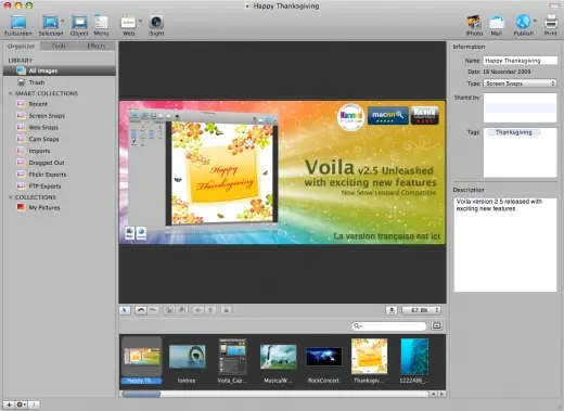 Voila 2.5.08 | Mac Os X | 16 MB Voila is a professional/ creativity tool which lets you capture, annotate, organize and share. Voila lets you capture any shape, capture multiple regions, menu, webpage, DOM elements and capture from iSight. Add annotations like arrow, text, lines, shapes, brush, paint, callouts, stamps and image as annotations. Add cool effects such as filters, edges, skew and share via Mail, Flickr, FTP or iPhoto. Voila lets you organize images in smart collections and custom collections. All the snaps are maintained in the central library. Download Voila and unleash your creativity and extract the productivity.