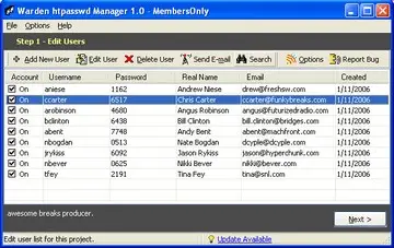 Now it's a snap to control authentication for Apache-compatible web servers. Add new accounts in seconds, suspend them in a click, and send email to your users from within the program. If you don't like making .htpasswd and .htaccess files the old fashioned way.