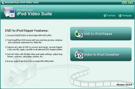 Wondershare iPod Video Suite v4.3.1.0 | 17.3 MB Wondershare iPod Video Suite is an all-in-one iPod video Conversion solution. This Suite includes 2 programs "Wondershare Video to iPod Converter" and "Wondershare DVD to iPod Ripper". So with this iPod Video Suite, you can convert both DVD media and video file media to iPod video/iPod movie. You can enjoy your favorite DVD and video clip on your iPod as a portable DVD Player.