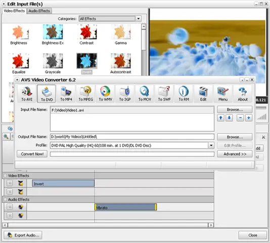 AVS Video Converter - program with advanced capabilities, all in one, converter, burn VCD, SVCD, DVD, an advanced video editor. A key feature of it is: converter AVI, MPEG, WMV, DVD video to AVI, MPEG, WMV, RM formats, burning DVD, SVCD or VCD, package converting, editing, video overlay effects and filters, extracting audio from video and save in a separate audio file, extract a frame (frame) and save as image, splitting into segments and connect video, video rotation, adding to the form of text, banners, logos, selection and codec setting for conversion, support: AVI (DivX, XviD, MS MPEG4, Uncompressed , Cinepak), MPEG (MPEG-1 and MPEG-2 Video), VOB (Video DVD, PAL and NTSC), WMV (Windows Media Video), RM (Real Networks Video), MOV (Quick Time) and other formats.