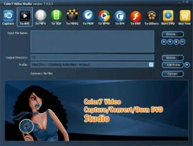 Color7 Video Studio ver. 7.9.6.1 | 13,6 MB Color 7 Video Capture/Convert/Burn DVD Studio is refined as premier software in video realization.It can : convert between all most-used video formats,such as AVI (DivX, XviD, etc), MPEG 1,2 and 4, QuickTime, Real Video, WMV and DVD, SVCD, VCD.