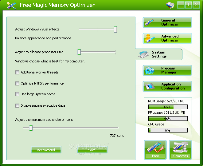 Magic Memory Optimizer is designed to tackle difficult but crucial problems of memory management. Memory is the most precious resource in your computer; when it becomes low, your computer will slow down severely or crash. Windows doesn't handle your memory properly by itself. Over time, no matter how much memory you have, Windows will slowly lose memory, bringing you to a critical state. Magic Memory Optimizer solves these problems by reclaiming lost memory for your programs.
