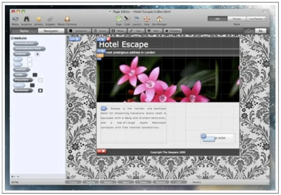 Flux has an amazing WYSIWYG rendering engine, which means you can drag, stretch, and move objects like a you can in a DTP application, and your webpages will look exactly how you intended.* Flux will generate all the code for you, with no unneccesary tags.
