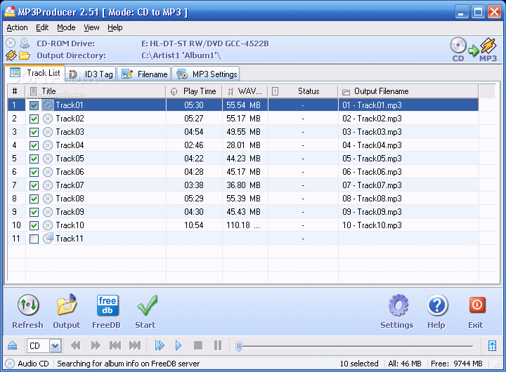MP3Producer is an ideal solution for converting (grabbing) your audio CD collection to a variety of the most popular compressed audio formats such as MP3, WAV, OGG, WMA with the excellent output quality at a high ripping speed! Besides with this software you can easily convert WAV to OGG, WAV to MP3, WAV to WMA, OGG to WAV and WMA to WAV. MP3Producer has the FreeDB function with customizable settings and search options that help you to retrieve the disk information (e.g. Artist, Album, Genre and track names) from FreeDB, a music information database on the Internet.MP3Producer supports different formats of MP3 (MPEG1 and MPEG2) and all bitrates (8-320 kbps, constant and variable), and OGG (constant, average and variable bitrates). Flexible settings allow you to define the quality of MP3, WAV and OGG files.