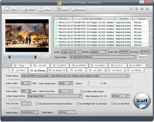 WinX DVD Ripper Platinum can rip the content of DVDs to all popular video formats such as AVI, MOV, FLV, WMV, MPEG, MP4, 3GP, etc. What’s more, it also owns the ability of ripping different DVDs (including encrypted DVDs) to Sony PSP, Apple iPhone, iPod, iPad, iTouch, Apple TV, Zune, Mobile phone, etc