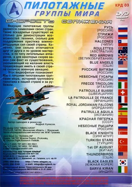 Описание: Ведущие пилотажные группы являются символами своих стран. Такие эскадрильи существуют не столько для демонстрации возможностей техники, сколько для поддержания престижа военно-воздушных сил своей страны. Конечно, они сильно отличаются друг от друга и по уровню мастерства, и по типу летательных аппаратов, а для некоторых скорее важен сам факт их существования, указывающий на желание власть предержащих иметь в своей стране сильную военную авиацию. Этот видеофильм познакомит Вас с лучшими пилотажными группами мира, историей группового пилотажа в нашей стране и за рубежом. Превосходный пилотаж, хорошее музыкальное оформление фильма, комментарии - все в лучшем стиле.