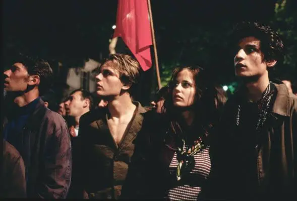 A love letter to movies (and the French new wave of the 1960s in particular), Bernardo Bertolucci's The Dreamers starts with a 1968 riot outside of a Parisian movie palace then burrows into an insular love triangle. Matthew (Michael Pitt, Hedwig and the Angry Inch), an expatriate American student, bonds with a twin brother and sister, Isabelle (Eva Green) and Theo (Louis Garrel), over their mutual love of film–they not only quote lines of dialogue, they act out small bits and challenge each other to name the cinematic source. Matthew suspects the twins of incest, but that doesn't stop him from falling into his own intimacies with Isabelle. As the threesome becomes threatened, Paris succumbs to student riots. The Dreamers aspires to be kinky, but the results are more decorative than decadent; nonetheless, the movie's lively energy recalls the careless and vital exuberance of Godard and Truffaut.